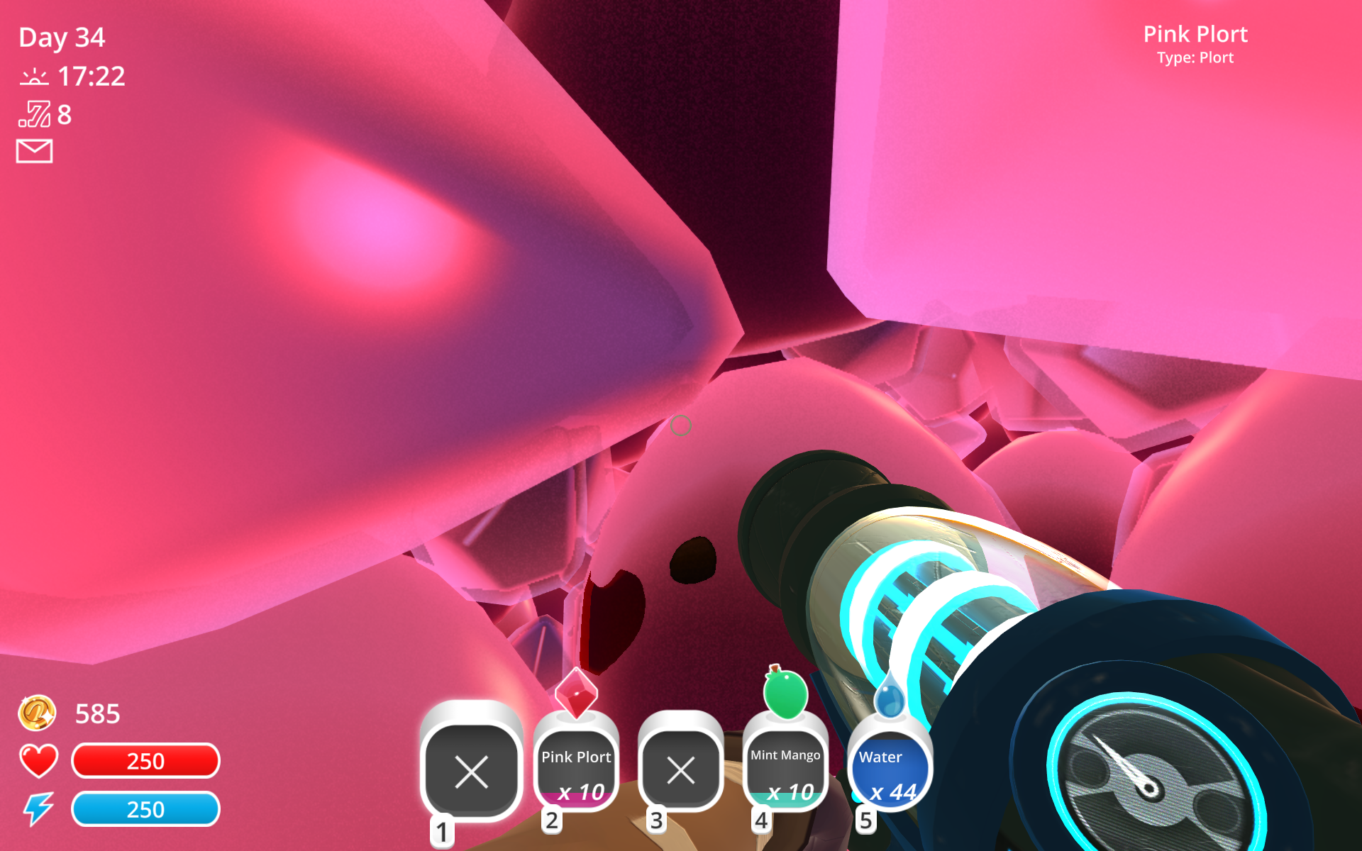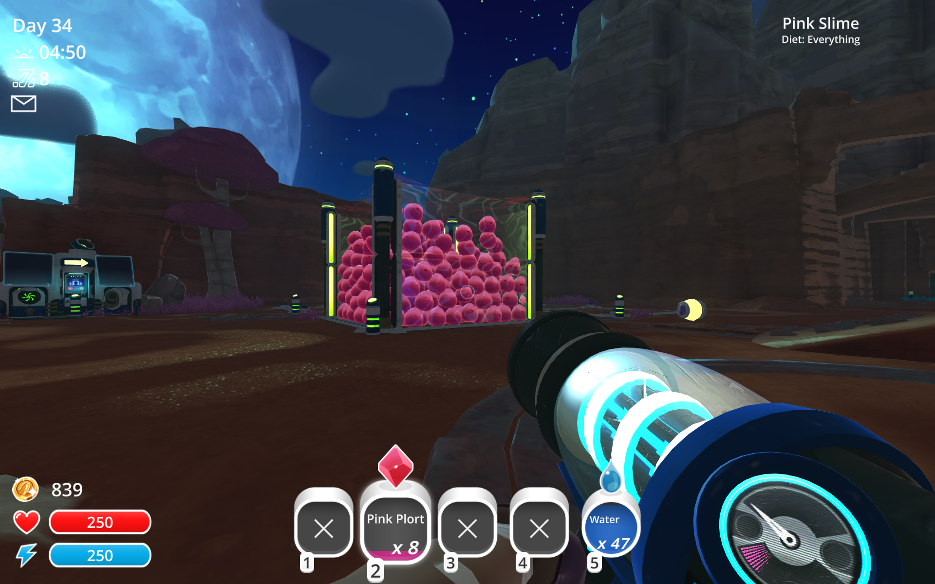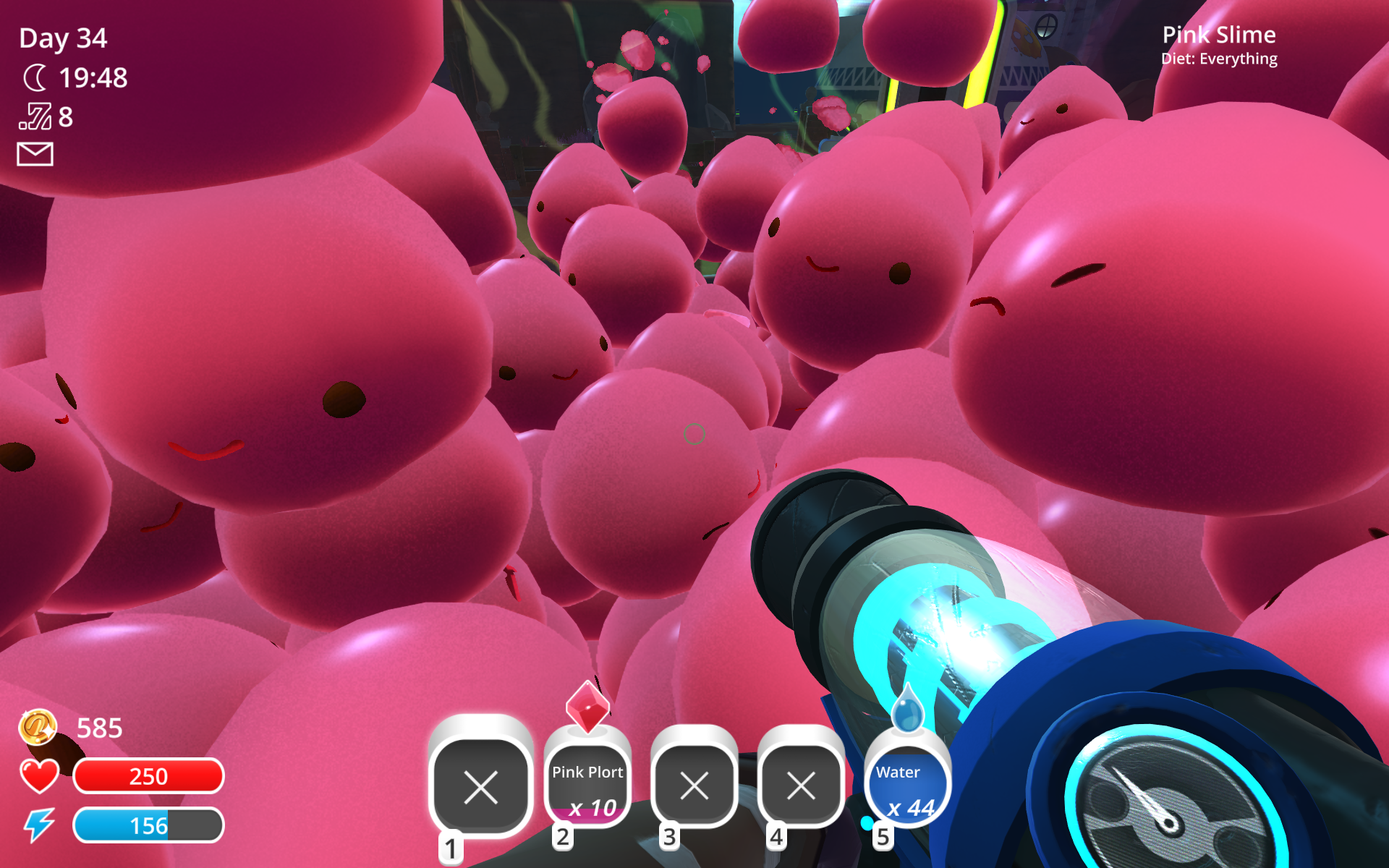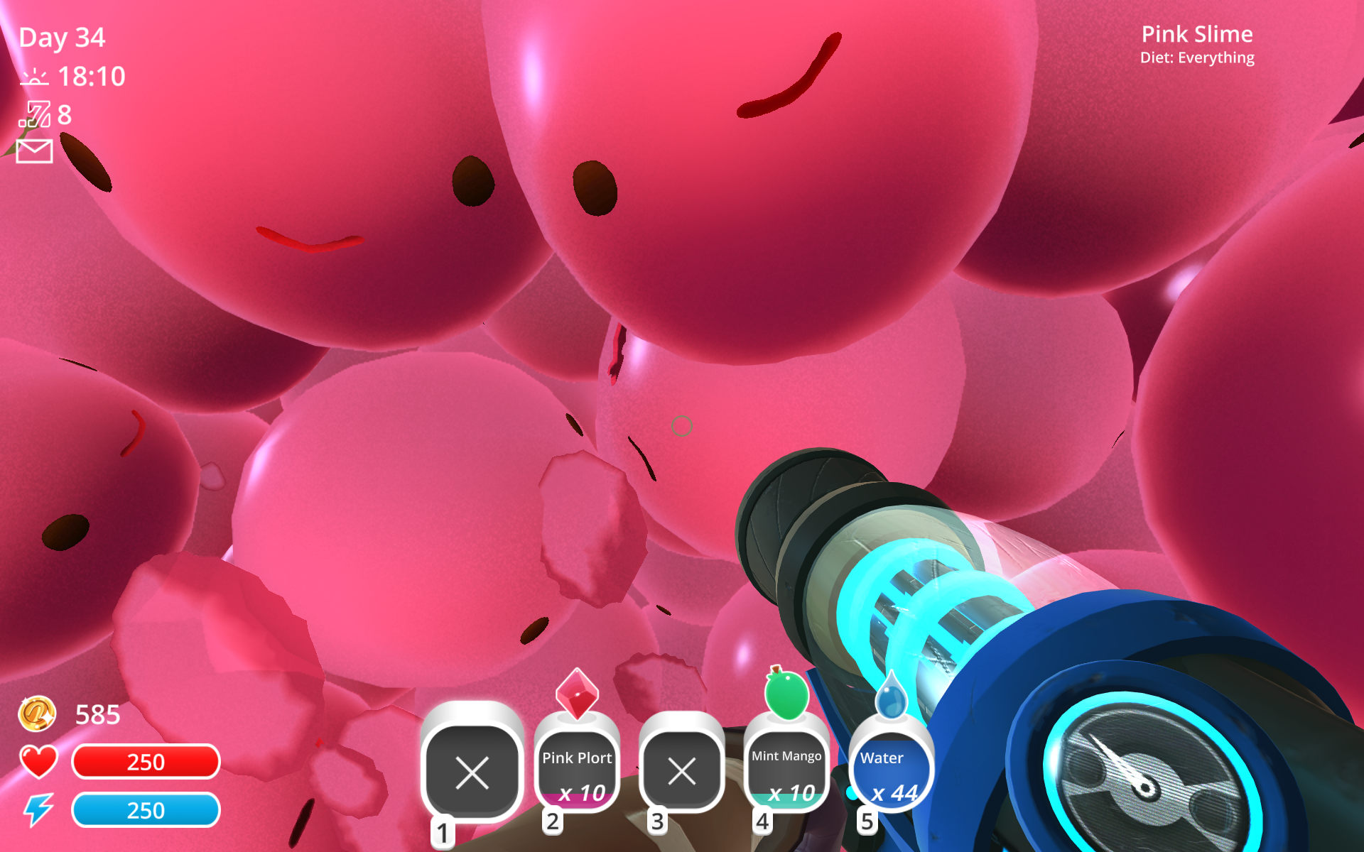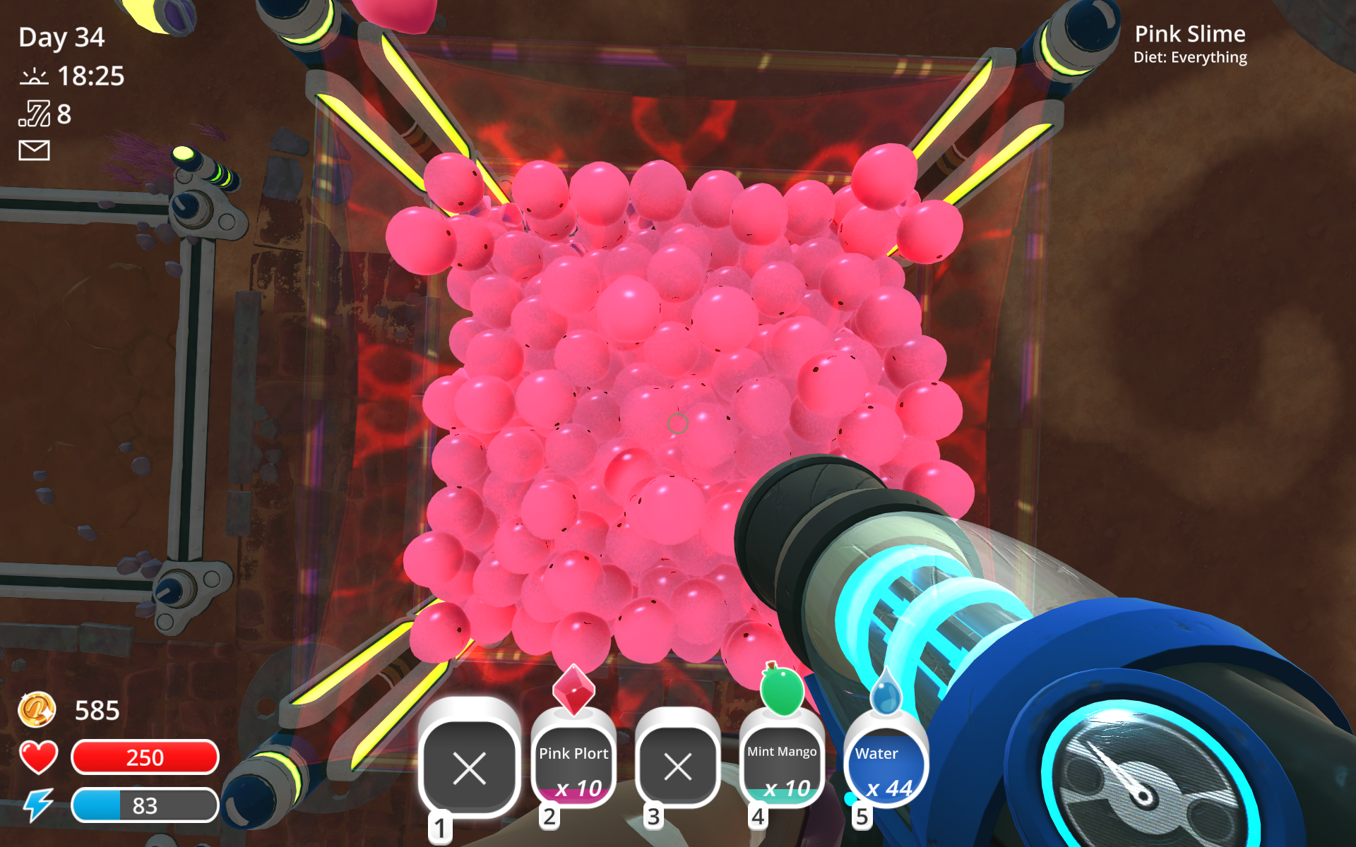 Slime Rancher is a science fiction farming game developed by Monomi Park and released in 2017. In it, you play a character who has moved from Earth to an alien planet in order to live life as a slime rancher. A slime rancher gathers slimes from around the planet, raises them in pens, feeds them and collects their crystalline refuse, which can be sold. This video takes up my old save file from when I was playing Slime Rancher in late 2017. I already had a stable farm, and some money saved, so I was able to create an empty pen with all of the possible upgrades to start my pile. There are many kinds of slimes to choose from in Slime Rancher, but my pile is of the default, Pink slimes, since they are the most common and easiest to gather. All of the other games in this project focus on lifeless, non-agential bodies. Slimes are alive, and have some limited agency, and this presented both unique insight and unique challenges in the creation of this pile.